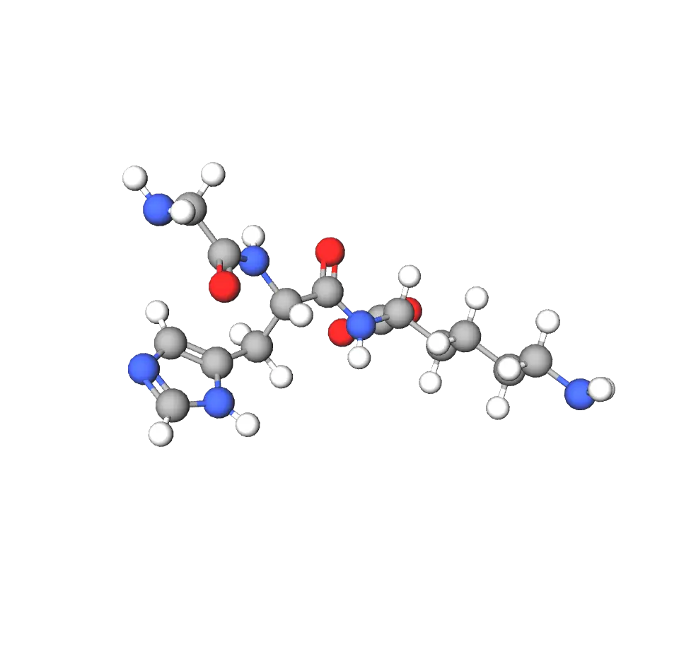 The core structure of GHK-Cu is the tripeptide sequence Gly-His-Lys, where the histidine residue facilitates a high-affinity coordination with copper(II) ions, forming a stable complex with a molecular weight of approximately 403 Da. This binding involves the imidazole nitrogen of histidine, the amino group of glycine, and the deprotonated amide nitrogen, creating a square-planar geometry that enhances the peptide's bioavailability and resistance to degradation in buffered solutions. Unlike larger peptides, its compact size allows for efficient diffusion in cellular assays, and modifications like liposomal encapsulation can further improve stability for extended experiments.